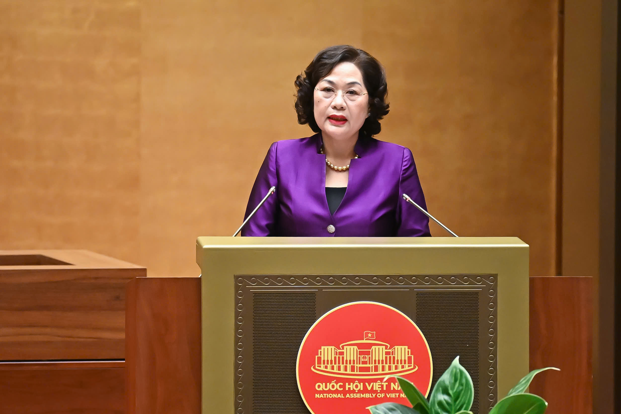 Thống đốc NHNN Nguyễn Thị Hồng trình bày báo cáo. Ảnh: Quốc hội