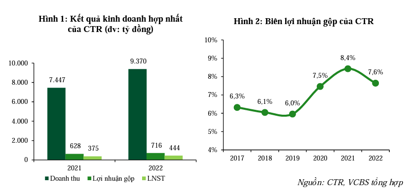 VCBS dự phóng doanh thu năm 2023 của CTR đạt 11.040 tỷ đồng (tăng 17,8% so với cùng kỳ), lợi nhuận thuộc về cổ đông công ty mẹ đạt 508 tỷ đồng (tăng 14,3% so với cùng kỳ), tương ứng với EPS là 4.440 VNĐ/ cổ phiếu.