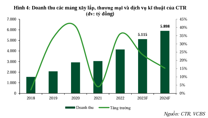 Tiền thân từ đơn vị xây lắp công trình viễn thông thuộc Tập đoàn Viettel, CTR đã dần mở rộng phạm vi kinh doanh sang các lĩnh vực xây dựng dân dụng, cung cấp dịch vụ kĩ thuật, sửa chữa và tích hợp thiết bị cho hộ gia đình, khu đô thị. Mặc dù chịu áp lực nhất định do sự chững lại của thị trường bất động sản và môi trường tín dụng thắt chặt, VCBS cho rằng các mảng kinh doanh trên có thể đóng góp hơn 5.000 tỷ đồng doanh thu trong năm 2023.