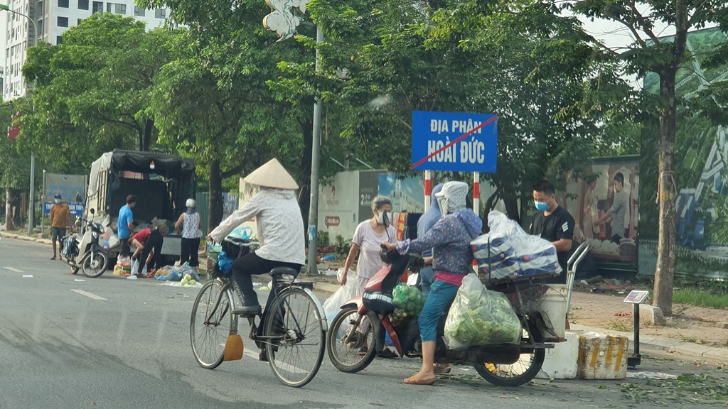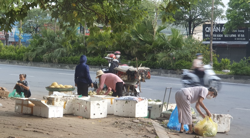 Theo ghi nhận của phóng viên, vào sáng 24/8, ngay trên đường Quốc lộ 32, gần chợ Nhổn (Phương Canh, Nam Từ Liêm) giáp ranh với cổng chào của huyện Hoài Đức, có rất nhiều người dân bán rau, củ, quả, hoa, quả các loại và cũng có rất nhiều người tới mua vì vị trí chợ cóc hoạt động đi lại tiện lợi, lại không cần phải có phiếu của chính quyền cấp mới được vào chợ. Trong khi gần đấy, UBND phường Phương Canh có treo biển khu vực cấm họp chợ.