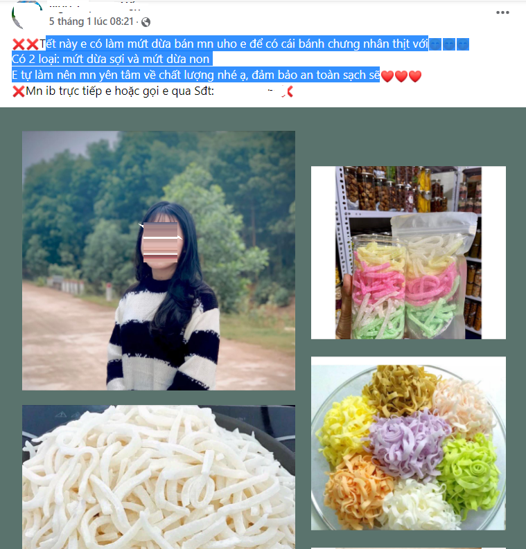 Tại nick name Ngô Thị N.Y đăng tải: Tết này em có làm mứt dừa bán mọi người ủng hộ. Có 2 loại: mứt dừa sợi và mứt dừa non. Chủ nick name cũng tự tin khẳng định: "mứt tự làm nên khách hàng yên tâm về chất lượng, đảm bảo an toàn sạch sẽ”.
