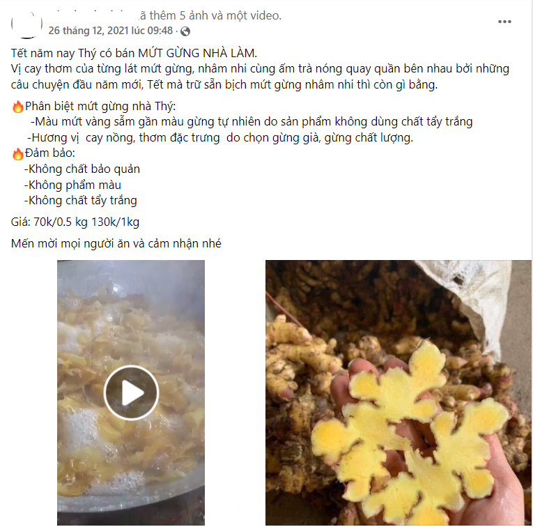 Một trang cá nhân khác có tên Hồ Thanh.T bán mứt gừng được quảng cáo có “vị cay thơm của từng lát mứt gừng, màu mứt vàng sẫm gần màu gừng tự nhiên do sản phẩm không dùng chất tẩy trắng, hương vị cay nồng, thơm đặc trưng do chọn gừng già, gừng chất lượng. Đảm bảo không chất bảo quản, không phẩm màu, không chất tẩy trắng, có giá 130.000 đồng/kg".