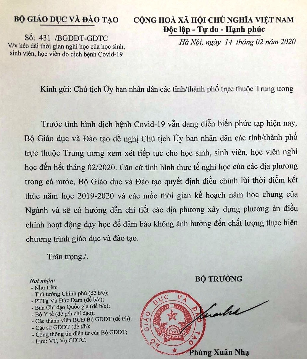 Chiều 14/2, Bộ trưởng Bộ Giáo dục và Đào tạo (GDĐT) Phùng Xuân Nhạ đã có công văn hỏa tốc gửi Chủ tịch Ủy ban nhân dân các tỉnh, thành phố trực thuộc Trung ương đề nghị kéo dài thời gian nghỉ học của học sinh, sinh viên, học viện do dịch bệnh Covid-19.