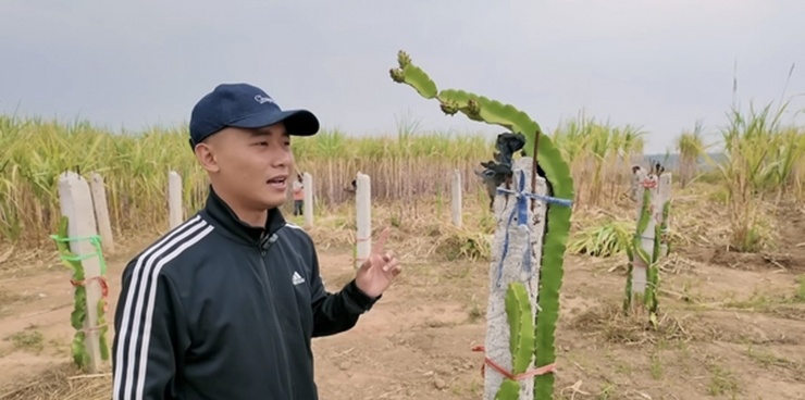Từ vùng đất hoang vu, sau một thời gian dài cải tạo, khu vực này đã được phủ xanh màu cây cỏ, vật nuôi cũng sinh trưởng tốt. Trong ảnh, Quang Linh Vlog và người dân địa phương đang tiến hành thu hoạch mía.