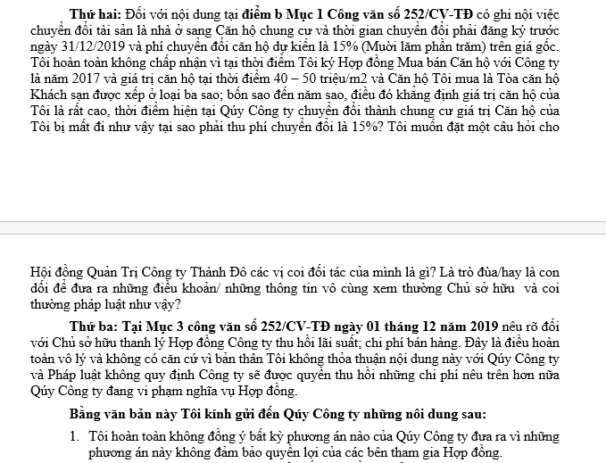 Về giải pháp thứ 3 mà Thành Đô đưa ra đó là nếu chủ sở hữu thanh lí hợp đồng thì phía chủ đầu tư sẽ thu hồi lãi suất, chi phí bán hàng, vị khách này cho biết, đây là điều "hoàn toàn vô lí và không có căn cứ".