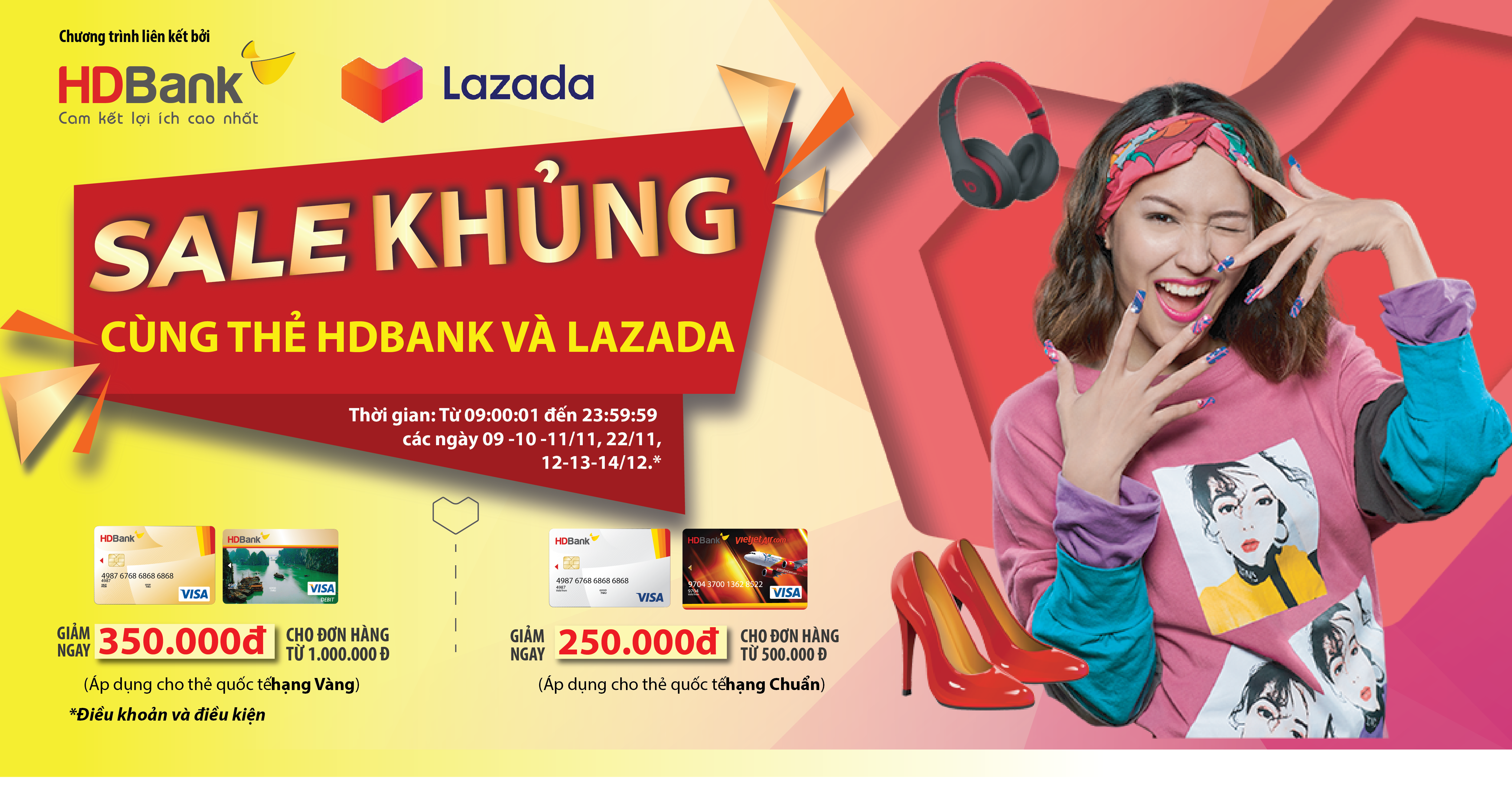 Tại Lazada, trong ngày 22/11 và từ ngày 12/12 đến 14/12/2019, khách hàng là chủ thẻ HDBank mua sắm được giảm từ 20% đến 30% trên hóa đơn thanh toán (tối đa 350.000 đồng cho đơn hàng từ 1 triệu trở lên).