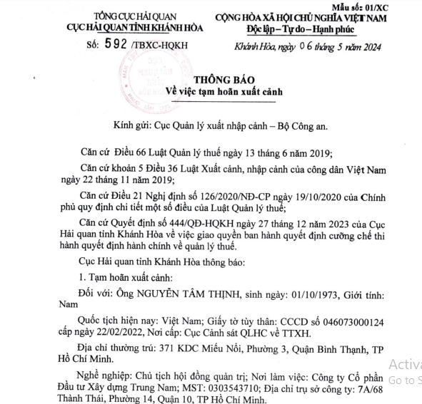Thông báo số 592/TBXC-HQKH về việc tạm hoãn xuất cảnh đối với ông Nguyễn Tâm Thịnh (SN 1973) - Chủ tịch HĐQT Công ty CP Đầu tư Xây dựng Trung Nam (Trung Nam Group), có địa chỉ tại TP Hồ Chí Minh (Nguồn: Cục Hải quan Khánh Hòa)