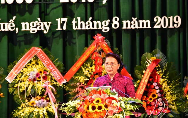 Chủ tịch Quốc hội Nguyễn Thị Kim Ngân phát biểu, trong đấu tranh cách mạng, nhân dân Thừa Thiên Huế với tinh thần “Tấn công, nổi dậy, anh dũng, kiên cường” đã làm nên một Thừa Thiên Huế anh hùng, thì ngày nay tinh thần đó phải được thể hiện ở sự đoàn kết, nhất trí, năng động, sáng tạo để xây dựng Thừa Thiên Huế thành một tỉnh giàu về kinh tế, đẹp về văn hoá, vững về chính trị, mạnh về quốc phòng, an ninh.