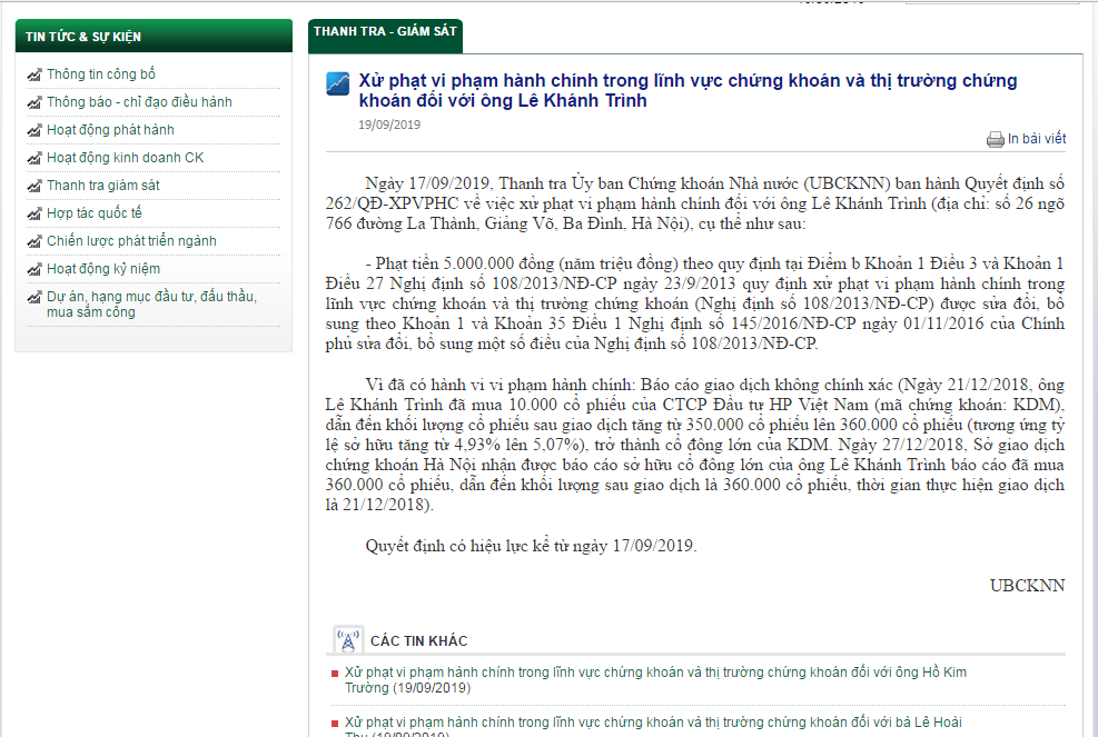 Theo đó,ngày 21/12/2018, ông Lê Khánh Trình đã mua 10.000 cổ phiếu của Công CP Đầu tư HP Việt Nam (mã chứng khoán: KDM), dẫn đến khối lượng cổ phiếu sau giao dịch tăng từ 350.000 cổ phiếu lên 360.000 cổ phiếu (tương ứng tỷ lệ sở hữu tăng từ 4,93% lên 5,07%), trở thành cổ đông lớn của KDM.