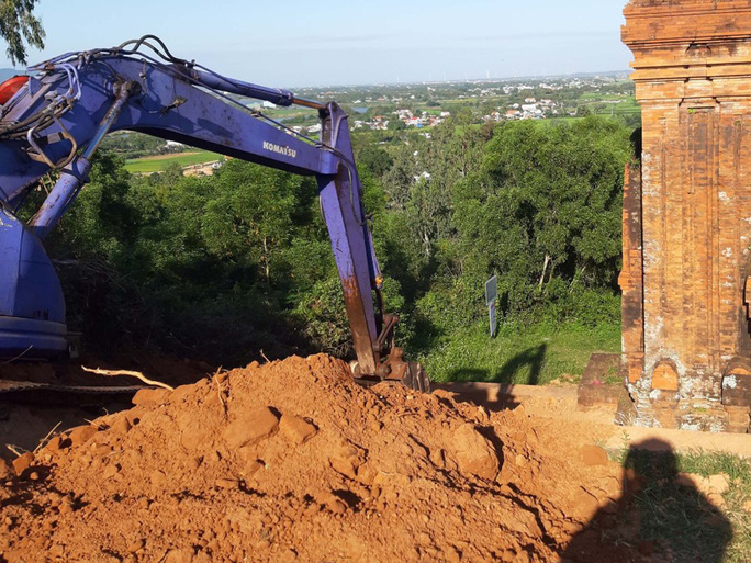 Đơn vị thi công đưa máy vào trong di tích tháp Bánh Ít để đào múc đất cạnh các tháp.