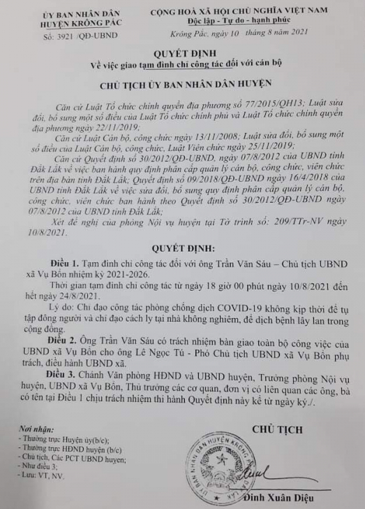 Tối 10/8, ông Đinh Xuân Diệu, Chủ tịch UBND huyện Krông Pắk, tỉnh Đắk Lắk đã ký quyết định tạm đình chỉ công tác 14 ngày kể từ ngày 10/8 đối với ông Trần Đình Sáu, Chủ tịch UBND xã Vụ Bổn.