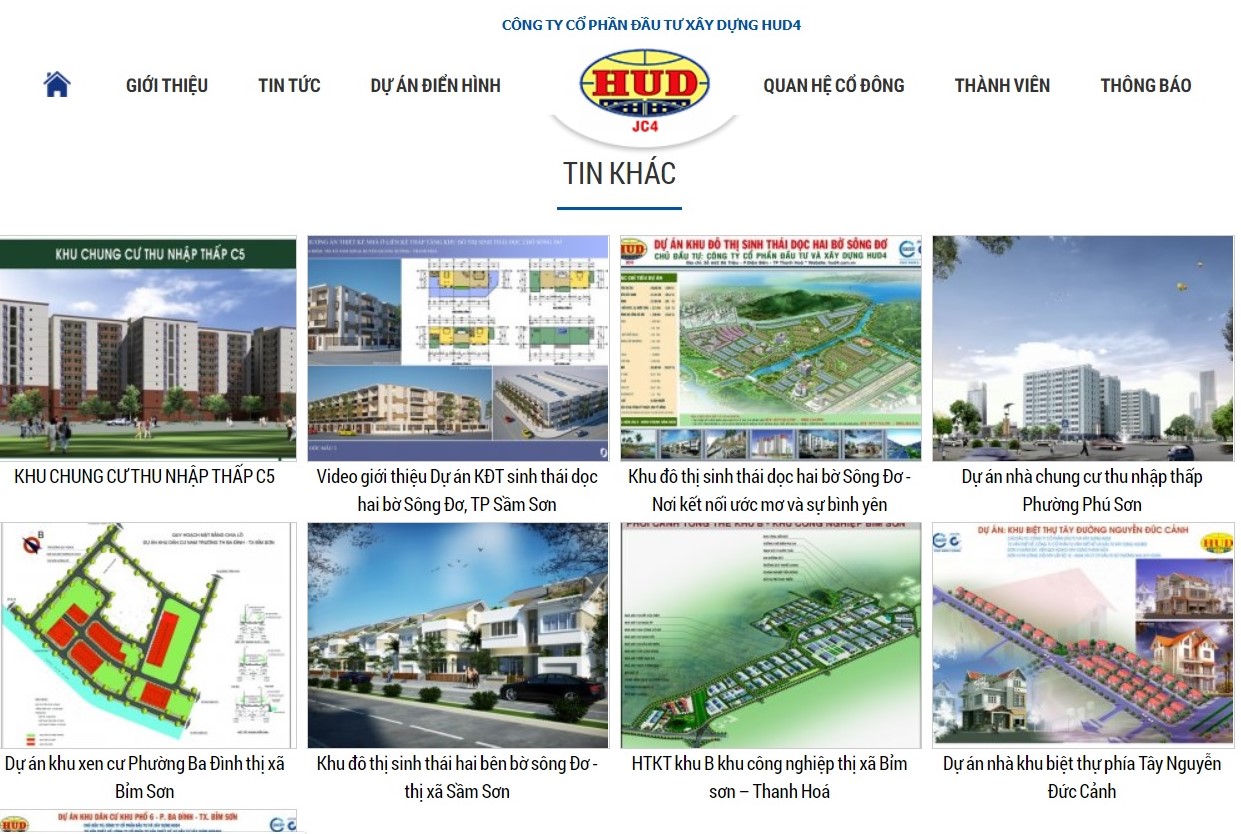 Tại tỉnh Thanh Hóa, HUD4 đang làm chủ một loạt dự án KĐT, dân cư có quy mô đáng kể. Điển hình: Dự án chung cư cao tầng Phú Sơn; Khu chung cư thu nhập thấp C5 Đông Vệ; Dự án KĐT sinh thái hai bờ Sông Đơ; Dự án Khu B – KCN Bỉm Sơn; Khu biệt thự Tây đường Nguyễn Đức Cảnh. Đáng chú ý, thời gian qua, HUD4 vẫn chưa hết “loay hoay” ở khâu GPMB cũng như tìm kiếm nguồn vốn để phục vụ một số dự án trọng điểm của mình (như dự án sinh thái sông Đơ và KCN Bỉm Sơn…)./.