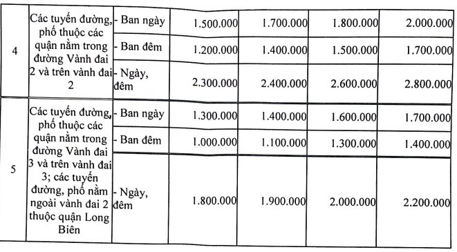 - Mức giá dịch vụ trông giữ xe ô tô đến 09 chỗ ngồi theo tháng tại các tòa nhà chung cư, trung tâm thương mại, giàn trông giữ xe cao tầng khác được đầu tư bằng nguồn vốn ngân sách Nhà nước: Bằng mức giá dịch vụ trông giữ xe ô tô đến 09 chỗ ngồi theo các tuyến đường, phố thuộc các quận nằm trong đường vành đai 2 và trên vành đai 2 (số thứ tự 4 tại bảng trên);