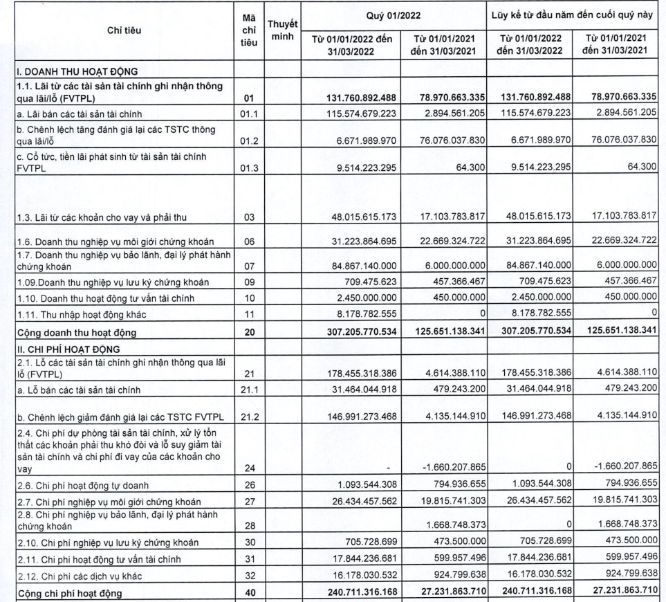Cụ thể, lãi từ các tài sản tài chính thông qua lãi/lỗ (FVTPL) đạt 131,7 tỷ đồng, tăng 68% so với cùng kỳ năm trước, tuy nhiên lỗ từ hoạt động tự doanh lại tăng 38 lần lên 178 tỷ đồng.