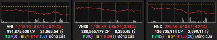Khép lại phiên giao dịch ngày 3/10, chỉ số VN-INdex bốc hơi hơn 37 điểm xuống còn 1.118,10 điểm. Toàn thị trường có gần 700 mã giảm giá, 774 mã đứng giá và gần 120 mã tăng giá. Khối lượng giao dịch toàn thị trường đạt hơn 1.201 triệu cổ phiếu, tương đương giá trị thanh khoản hơn 24.745 tỷ đồng.