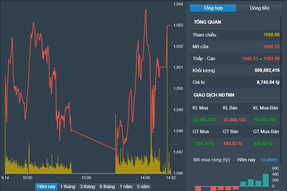 Khối ngoại tiếp tục mạch mua ròng trong phiên hôm nay. Cụ thể, nhà đầu tư nước ngoài mua ròng gần 420 tỷ đồng trên HOSE, hơn 899 triệu đồng trên UPCOM, trong khi chỉ bán ròng 3,9 tỷ đồng trên HNX.