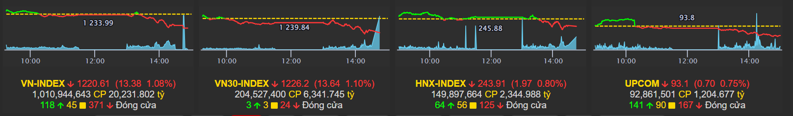 Kết phiên, VN-Index kết phiên với mức giảm 13,38 điểm (tương đương 1,08 %) xuống mốc 1.220 điểm. HNX-Index giảm 2 điểm và UPCoM-Index giảm 0,7 điểm. Thanh khoản sàn HoSE hôm nay giảm nhẹ về hơn 20.200 tỷ đồng.