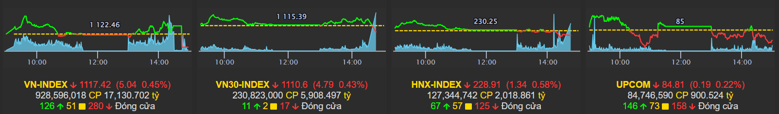 Kết phiên, VN-Index giảm 5 điểm (tương đương 0,45%) xuống mốc 1.117 điểm. HNX-Index giảm 1,34 điểm (0,58%) xuống 228,91 điểm. UPCoM-Index giảm 0,18 điểm (0,21%) xuống 84,82 điểm. Thanh khoản tiếp tục cải thiện với giá trị khớp lệnh trên HOSE đạt trên 15.100 tỷ đồng.