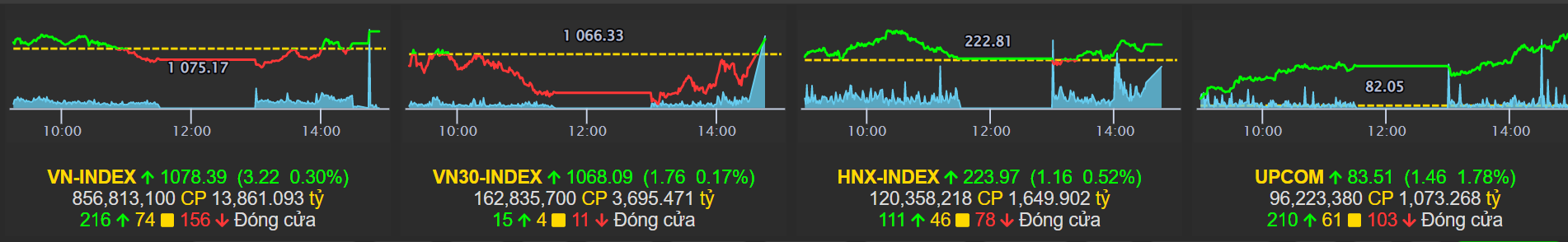 Trong khi đó, HNX-Index tăng 1,16 điểm (+0,52%) lên 223,97 điểm. UpCoM-Index tăng 1,46 điểm (+1,78%) lên 83,51 điểm.