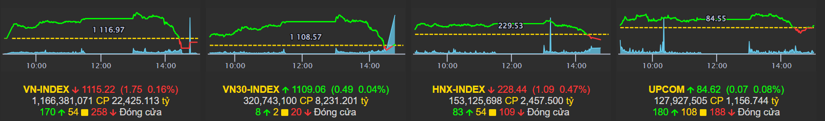 Tuy nhiên từ 2h chiều, lực bán càng lúc càng mạnh, nhà đầu tư chốt lời khi chứng khoán đạt đỉnh từ đầu năm. VN-Index đảo chiều từ tăng thành giảm, đóng cửa tại 1.115 điểm.