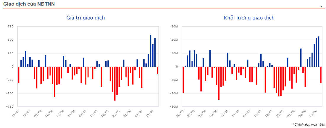 Sau 6 phiên mua ròng liên tiếp, khối ngoại trở lại bán ròng trong phiên chiều với thanh khoản 117 tỷ đồng. Trong đó, NVL bị xả mạnh với giá trị bán ròng lên tới 344 tỷ đồng, ngoài ra VNM (-66 tỷ), VCB (-54 tỷ), VIC (-31 tỷ)… cũng bị bán ròng mạnh.