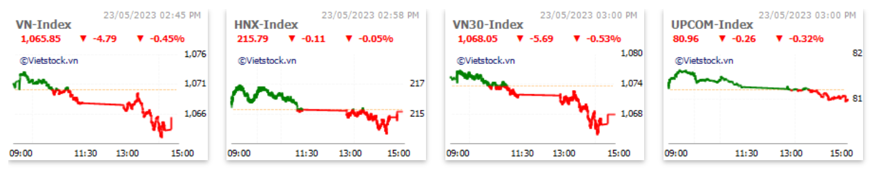 Kết phiên, VN-Index đóng cửa ở mốc 1.065,85 điểm, giảm 4,79 điểm, tương ứng 0,45%. Thanh khoản ở mức trung bình với 12.800 tỷ đồng. HNX-Index đóng cửa tại 215,75, giảm 0,11 điểm. UPCoM giảm 0,21 điểm (0,26%) còn mức 81 điểm.