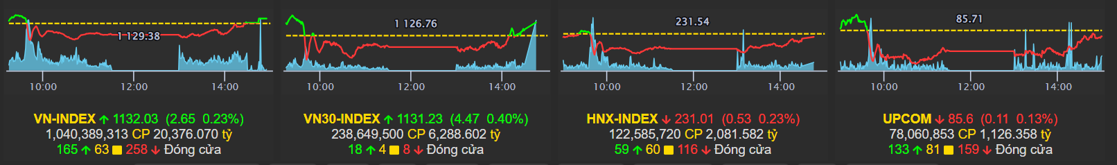 Kết phiên, VN-Index giảm 5,61 điểm, tương đương 0,5% xuống 1.123,77 điểm. HNX-Index giảm 2,42 điểm, tương đương 1,04% về 229,12 điểm. UPCoM-Index giảm 0,41 điểm, tương đương 0,48% đạt 85,3 điểm. Thanh khoản thị trường ở mức cao, với giá trị giao dịch trên HoSE đạt hơn 20.300 tỷ đồng, trong đó nhóm VN30 giao dịch gần 7.400 tỷ.