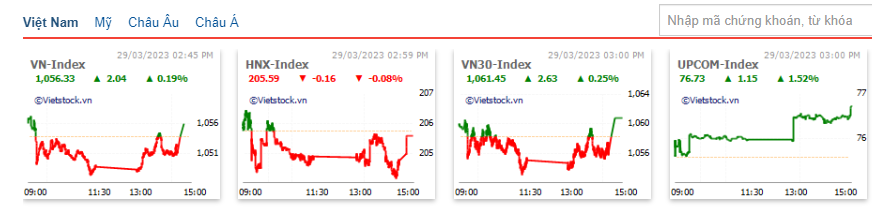 Kết thúc phiên giao dịch, VN-Index tăng 2,04 điểm, tương đương với 0,19% lên 1.056,33 điểm. Giao dịch kém tích cực hơn, HNX-Index đóng cửa tại 205,59 điểm, giảm 0,17 điểm. Thanh khoản giảm mạnh 26% so với phiên hôm trước khi giá trị giao dịch chỉ đạt 8.300 tỷ đồng trên HOSE.