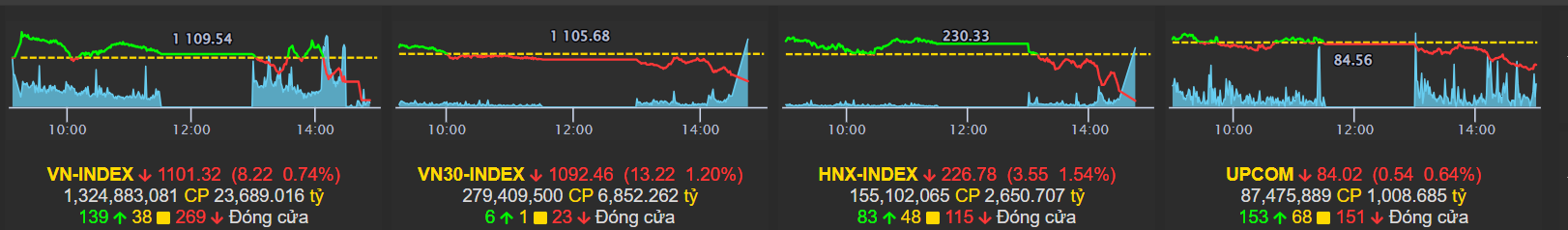 Kết phiên, VN-Index giảm 8,22 điểm, tương đương với 0,74% xuống 1.101,32 điểm; VN30-Index giảm 13,22 điểm, tương đương 1,2% xuống 1.092,46 điểm. Sàn HNX và cả sàn UPCoM, khi ghi nhận mức giảm lần lượt là 3,55 điểm (-1,54%) xuống 226,78 điểm và 0,54 điểm (-0,64%) về mốc 84,02 điểm.