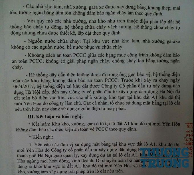 Theo Biên Bản Kiểm tra ngày 13/4/2017 của các ngành chức năng quận Cầu Giấy (UBND phường Yên Hòa, Phòng Cảnh sát PCCC số 3) thì hầu hết các kho tạm, nhà xưởng trên lô đất A1 đều vi phạm trật tự xây dựng và vi phạm an toàn cháy nổ. Cụ thể: Các kho tạm, nhà xưởng được xây dựng bằng khung thép, mái tôn, tường ngăn bằng tôn không đảm bảo ngăn cháy lan theo quy định; Không lắp đặt hệ thống báo cháy tự động, hệ thống chữa cháy vách tường; Không có giải pháp ngăn cháy; Không có nguồn nước chữa cháy; Hệ thống điện trước khi xảy ra cháy được Cty XD Dân Dụng cấp; Việc lắp đặt và xây dựng hệ thống kho bãi là hoàn toàn sai quy định…vv...