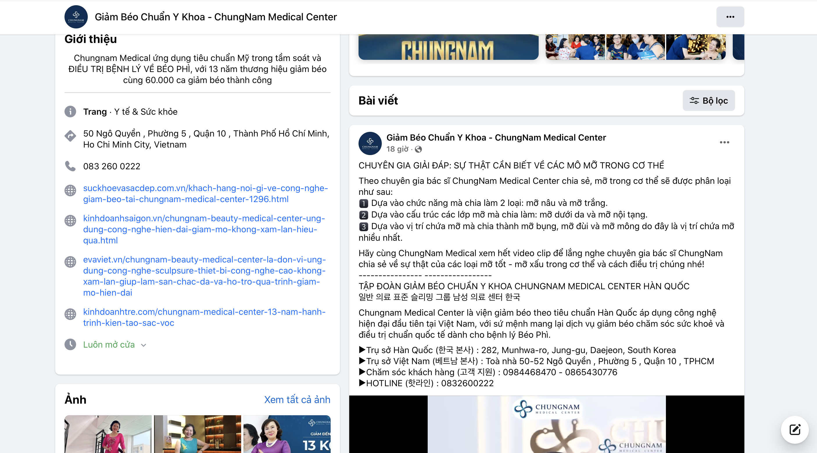 Tiếp đến trang Facebook có tên "Giảm Béo Chuẩn Y Khoa - ChungNam Medical Center" cũng vừa đăng tải ngày 21/5 các thông tin về dịch vụ giảm béo tại ChungNam Medical Center địa chỉ 50-52 Ngô Quyền, Phường 5, Quận 10, TPHCM.
