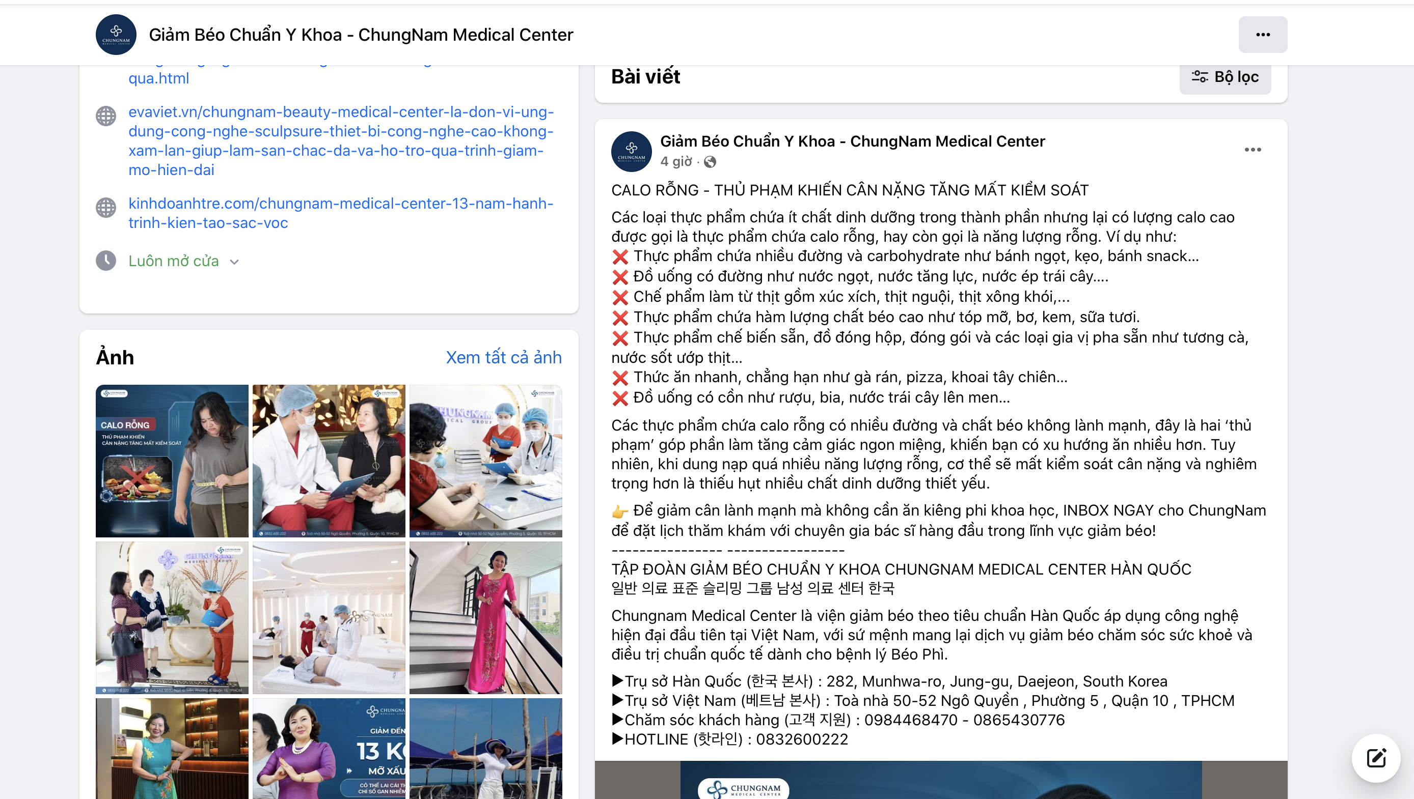 Cụ thể, ngày 21/5 ghi nhận của PV tại trang facebook “ Phòng Khám Giảm Béo ChungNam Medical Một Lần Công Nghệ Cao”, hiện vẫn đăng tải các thông tin quảng cáo “Chungnam Medical Center là viện giảm béo theo tiêu chuẩn Hàn Quốc áp dụng công nghệ hiện đại đầu tiên tại Việt Nam, với sứ mệnh mang lại dịch vụ giảm béo chăm sóc sức khoẻ và điều trị chuẩn quốc tế dành cho bệnh lý Béo Phì”.