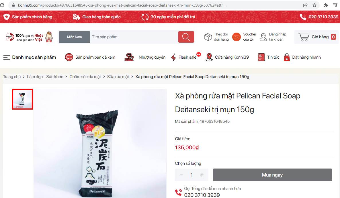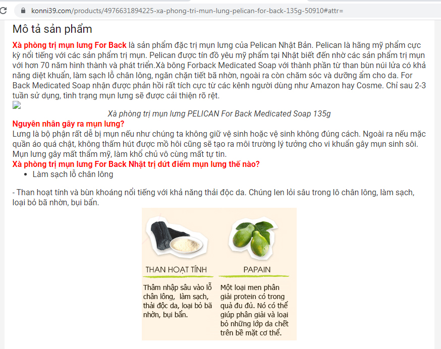 Sản phẩm xà phòng rửa mặt Pelican Facial Soap Deitanseki được cơ sở Konni39 quảng cáo "là phương pháp hữu hiệu giúp trị sạch mụn đỏ, mụn sưng trên bề mặt da, kích thích tiêu trừ mụn ẩn dưới da". Ảnh chụp màn hình website