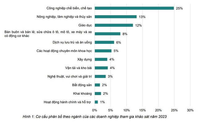Theo Khảo sát được tiến hành cho đến cuối năm 2023 với sự tham gia của 500 doanh nghiệp vừa và nhỏ trên toàn quốc từ các ngành công nghiệp khác nhau bao gồm công nghiệp chế biến và sản xuất, khai thác, bán buôn và bán lẻ, giáo dục và đào tạo, bất động sản..., nhìn chung chỉ có khoảng 25% doanh nghiệp được khảo sát thuộc nhóm ngành công nghiệp chế biến và sản xuất cho thấy mức độ quan tâm cao đối với chuyển đổi số trong lĩnh vực này. Tiếp theo là nhóm các doanh nghiệp trong ngành nông nghiệp, lâm nghiệp, thủy hải sản và ngành giáo dục chiếm khoảng từ 12-13%.