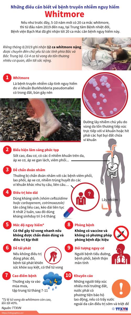 Whitmore là một bệnh truyền nhiễm nguy hiểm do vi khuẩn đất gây ra. Bệnh có tỉ lệ tử vong cao nhưng hoàn toàn có thể điều trị được nếu bệnh được chẩn đoán đúng và điều trị đúng kháng sinh.