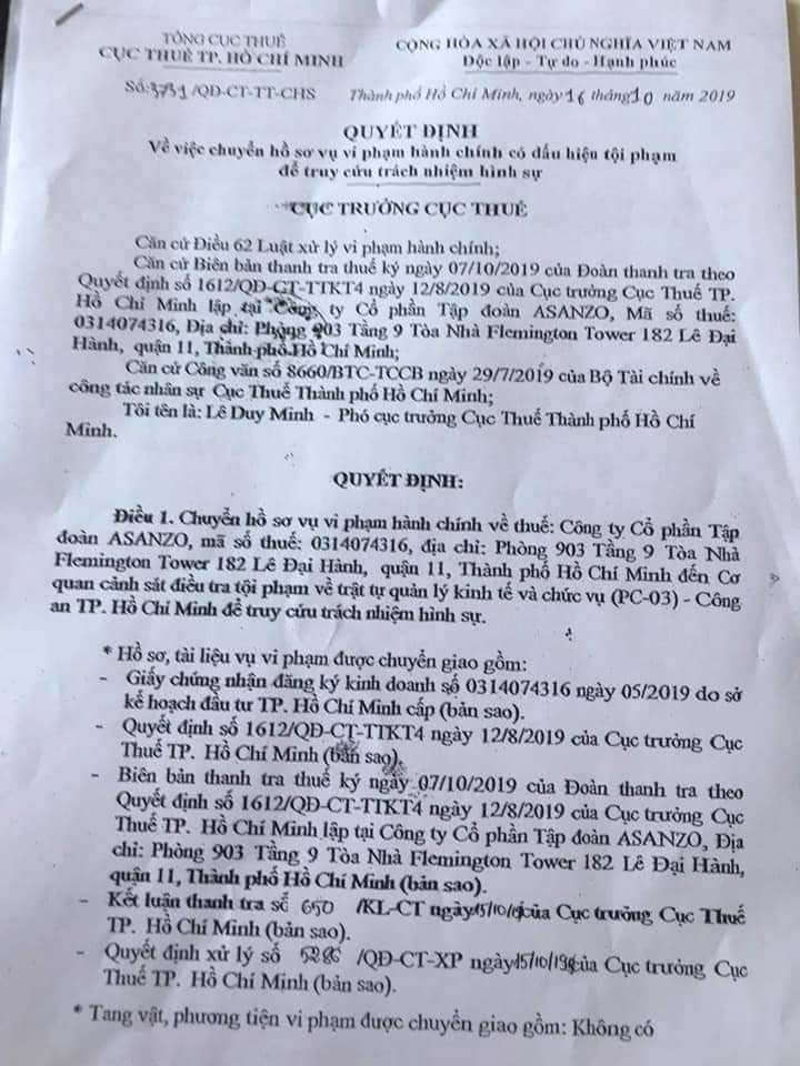 Thông tin từ Cục Thuế Tp.HCM ngày 23/10 cho biết, dựa theo các quy định của Bộ Tài chính, Luật xử lý vi phạm hành chính và căn cứ vào Biên bản thanh tra thuế kỳ ngày 7/10/2019 tại Công ty Asanzo, cơ quan này đã ký Quyết định 3731 chuyển hồ sơ vụ vi phạm hành chính có dấu hiệu tội phạm để truy cứu trách nhiệm hình sự về hành vi trốn thuế đối với Công ty Cổ phần tập đoàn Asanzo cho Công an Tp.HCM và Bộ Công an.
