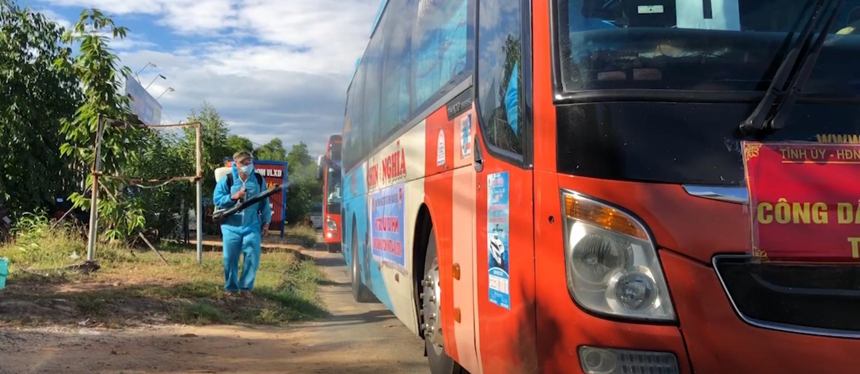 Ngay khi 10 chiếc ô tô khách kết thúc chuyến đi đón công dân về từ tâm dịch để bàn giao cho khu cách ly tập trung, công tác khử khuẩn phương tiện, môi trường và hành lý người dân được khẩn trương tiến hành.
