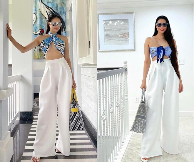 2 lần diện mốt quấn khăn làm áo, Phạm Hương đều tận dụng chiếc quần trắng lưng cao quen thuộc để phối cùng.