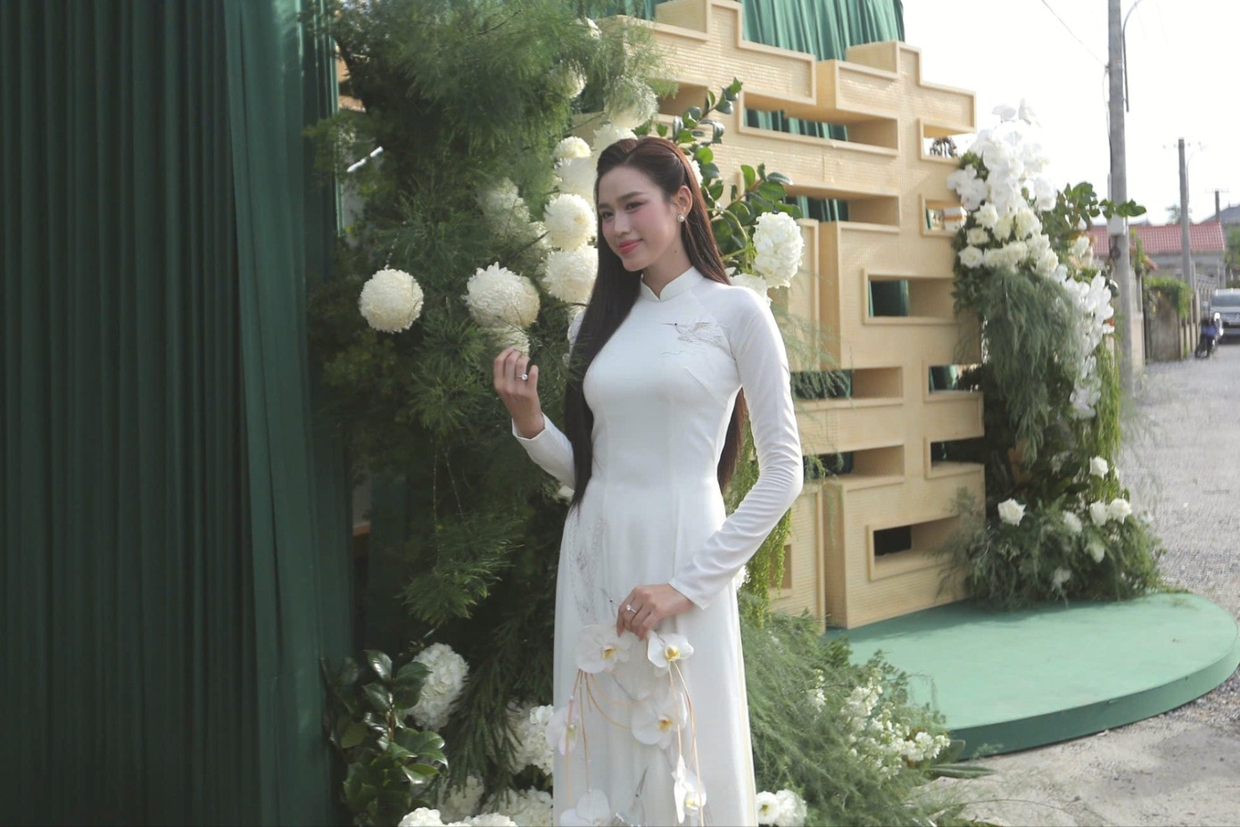 Một số hình ảnh trong lễ nạp tài đã được hé lộ. Có thể thấy, đám cưới hào môn được trang trí với tông xanh chủ đạo, ngập tràn hoa tươi màu trắng trông vô cùng mát mắt. Không gian được lấy cảm hứng từ sắc xanh mộc bản - biểu tượng của sự thanh khiết, nền nã.
