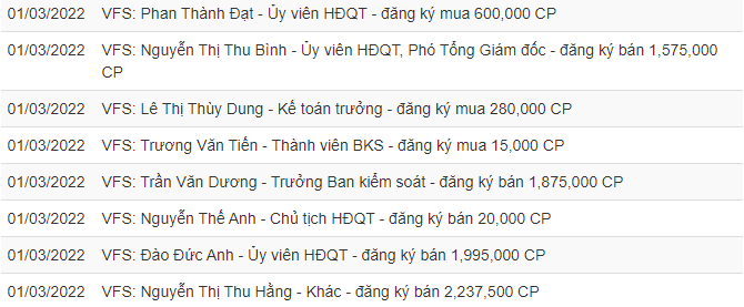 Ở chiều ngược lại, ông Phan Thành Đạt, Ủy viên HĐQT Công ty đăng ký mua 600.000 cổ phiếu VFS. Bà Lê Thị Thùy Dung, Kế toán trưởng Công ty đăng ký mua 280.000 cổ phiếu VFS và ông Trương Văn Tiến, Thành viên Ban kiểm soát Công ty đăng ký mua 15.000 cổ phiếu VFS. Trước giao dịch, ông Tiến và bà Dung đang nắm giữ 500 cổ phiếu VFS, trong khi ông Đạt chưa sở hữu cổ phiếu nào của VFS.