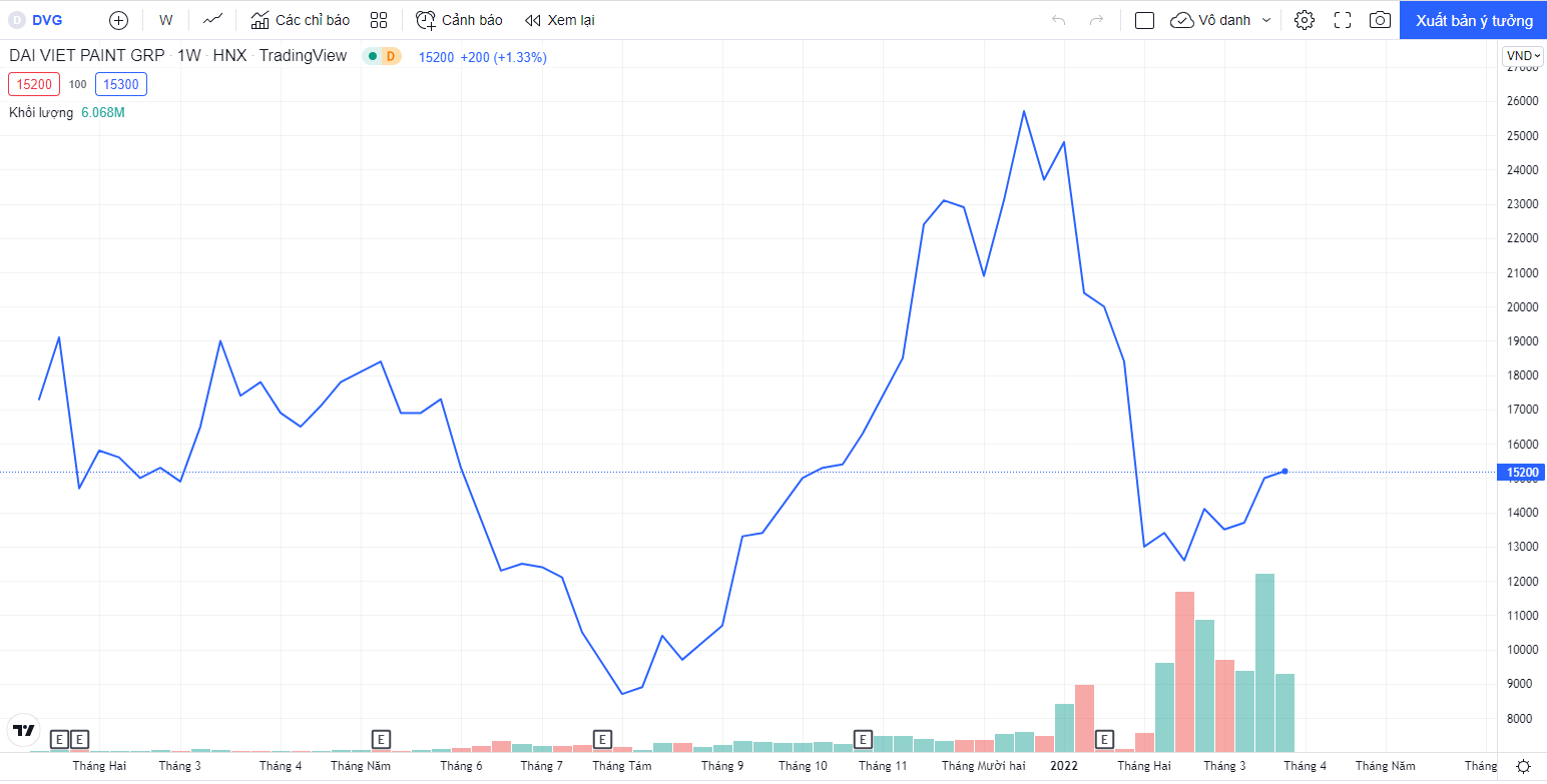 Sau khi giảm sâu, DVG tăng trở lại, xác lập vùng đỉnh mới ở mức 24.700 đồng/cổ phiếu (giá đóng cửa phiên 4/1/2022). Từ vùng đỉnh, chỉ gần 2 tháng sau đó DVG giảm mạnh, mất đi 50% thị giá. Hiện DVG giao dịch quanh mức 15.200 đồng/cổ phiếu.