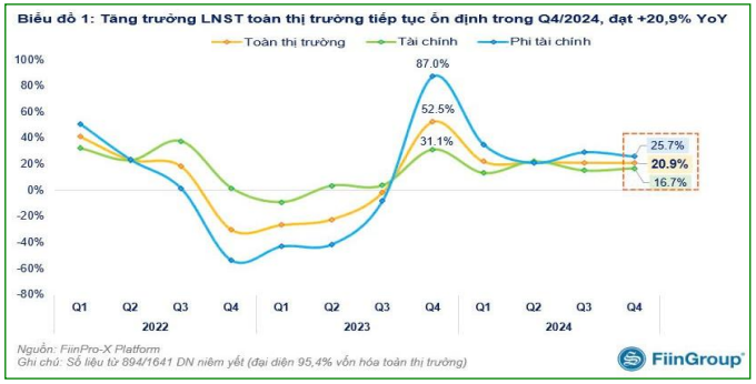 Theo FiinGroup cập nhật tính tới ngày 03/02/2025, thị trường hiện đã có khoảng 55% các doanh nghiệp công bố BCTC Q4/2024, chiếm 95% vốn hóa thị trường chứng khoán. Tổng lợi nhuận của khối các doanh nghiệp đã công bố BCTC Q4/2024 này tăng 20,9% so với cùng kỳ năm trước; duy trì mức tăng ổn định trong 4 quý.