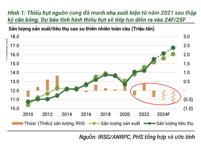 Nguồn cung cao su thiên nhiên toàn cầu dự kiến sẽ chỉ tăng trưởng bình quân khoảng 1 - 3%/năm trong giai đoạn 2024 – 2025. Trong khi đó, diện tích canh tác cao su tại Thái Lan và Indonesia (chiếm 51% tổng sản lượng mủ toàn cầu) liên tiếp sụt giảm và chưa có dấu hiệu dừng lại do dịch bệnh trên cây cao su cùng với xu hướng các hộ nông dân chuyển sang trồng các cây công nghiệp khác có hiệu suất kinh tế cao hơn khi việc trồng cây cao su mất từ 5 – 7 năm mới có thể khai thác mủ được.