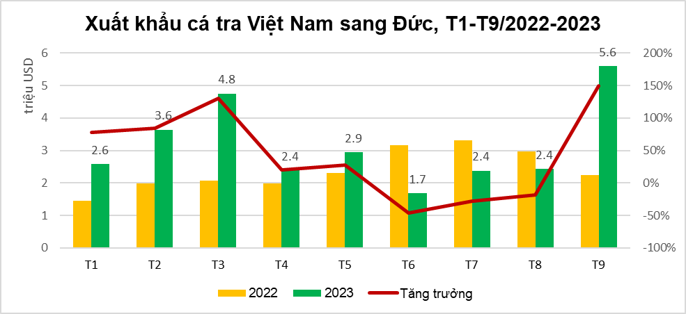 Tính đến hết tháng 9/2023, kim ngạch xuất khẩu cá tra sang Đức đạt hơn 28 triệu USD, tăng 32% so với cùng kỳ năm ngoái, đóng góp hơn 1/5 vào tổng nhập khẩu cá tra của EU từ Việt Nam. Đáng chú ý, tháng 9/2023, xuất khẩu cá tra sang thị trường này ghi nhận mức giá trị cao nhất trong 2 năm trở lại đây, với kim ngạch tăng 149% so với tháng 9/2022.
