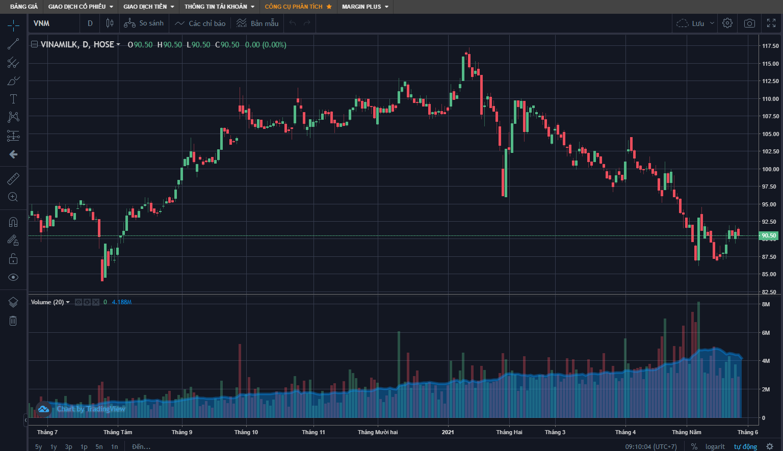 Mở cửa phiên giao dịch ngày 28/5 (lúc 9h05p), cổ phiếu VNM đi ngang so với phiên giao dịch trước đó với mức giá 90.500 đồng/cổ phiếu do chưa có thanh khoản. Giá trị vốn hóa thị trường đạt 189,141.05 tỷ đồng.