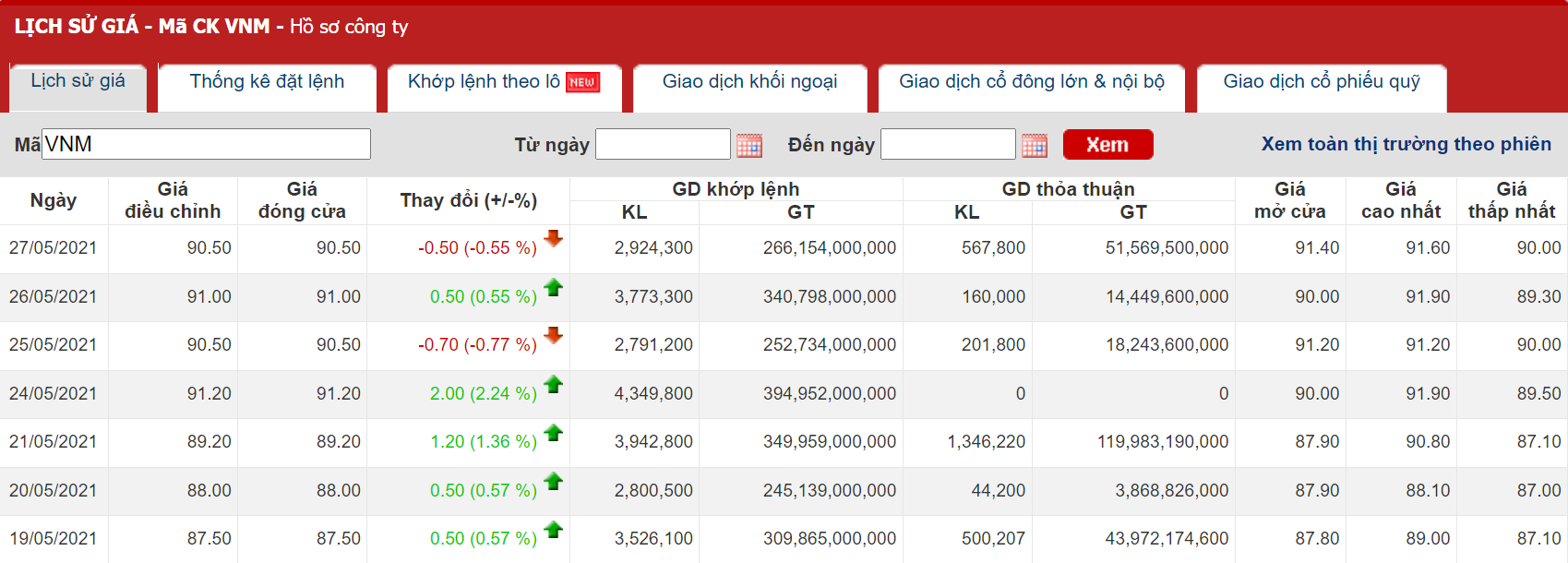 Dữ liệu giao dịch cổ phiếu VNM. Nguồn: Vn-Index.