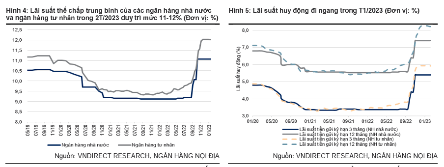 Bên cạnh đó, VNDirect kỳ vọng xu hướng lãi suất tăng sẽ tiệm cận điểm đảo chiều từ quý2/2023 nhờ lãi suất huy động hạ nhiệt. Cụ thể, lãi suất điều hành của FED có thể đạt đỉnh vào quý2/2023, giúp giảm áp lực lên tỷ giá và lãi suất của Việt Nam. NHNN sẽ chủ động hơn trong việc hỗ trợ thanh khoản cho thị trường thông qua nghiệp vụ thị trường mở hoặc mua ngoại tệ để tăng dự trữ ngoại hối. Nhu cầu tín dụng chậm lại do tăng trưởng kinh tế giảm tốc và thị trường bất động sản ảm đạm cũng sẽ góp phần hạ nhiệt lãi suất.