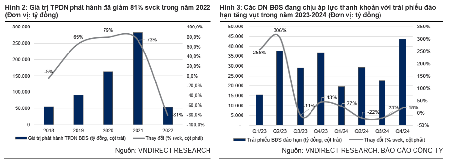 Bên cạnh đó, vào giữa tháng 2/2023, 54 tổ chức phát hành trái phiếu doanh nghiệp đã thông báo chậm trả lãi, làm dấy lên lo ngại về thanh khoản. VNDirect ước tính khoảng 23.000 tỷ đồng trái phiếu từ các tổ chức này sẽ đáo hạn trong 2023 (90% đến từ doanh nghiệp bất động sản).