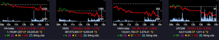 Khép lại phiên giao dịch, VN-Index đóng cửa ở mốc 1223.81, giảm mạnh 14.58 điểm (-1.18%). Thanh khoản tiếp tục được duy trì ở mức tốt khi có hơn 1,1 tỷ cổ phiếu được giao dịch, tổng khối lượng khớp lệnh trên toàn sàn đạt mức hơn 26 nghìn tỷ đồng. Sắc đỏ gần như bao chùm toàn bảng điện trong ngày hôm nay với 409 mã giảm điểm, trong khi đó số mã tăng điểm chỉ là 99, còn lại là 59 mã đóng cửa ở mốc tham chiếu.