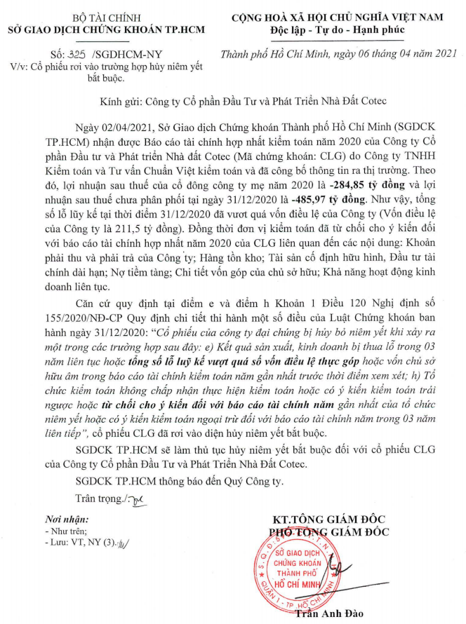 Sở GDCK TP HCM (HOSE) thông báo cổ phiếu CLG của CTCP Đầu tư và Phát Triển Nhà Đất Cotec (MCK: CLG) rơi vào trường hợp hủy niêm yết bắt buộc.